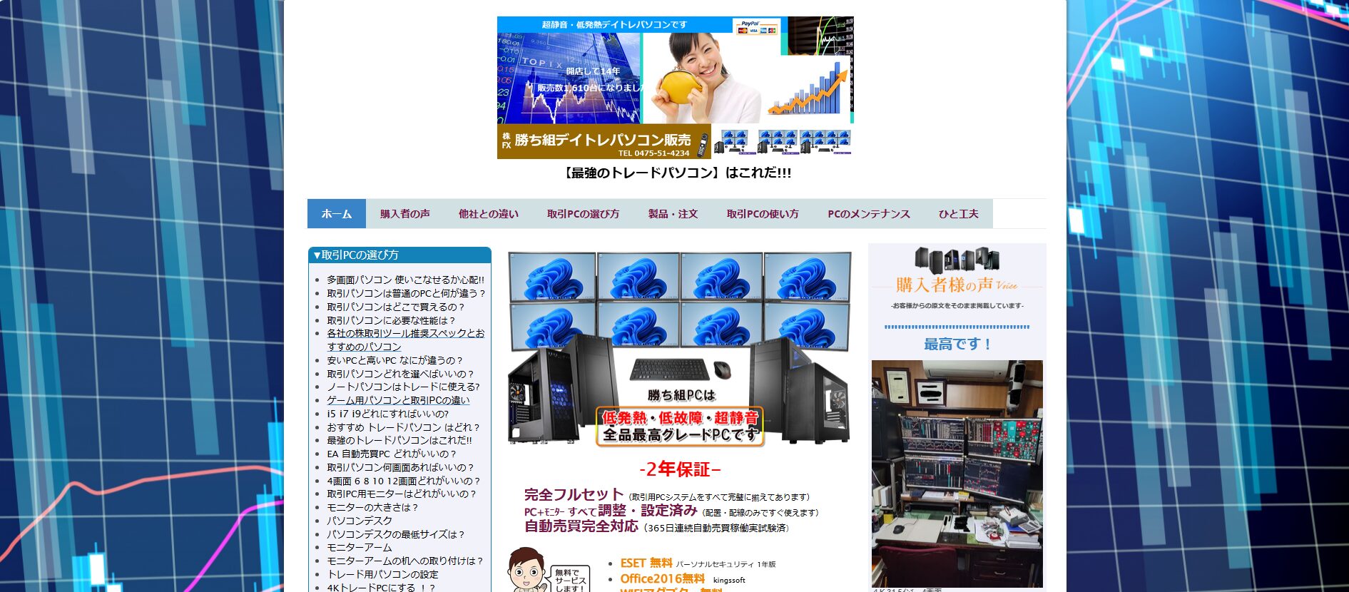 勝ち組デイトレパソコン販売では、トレードを始める方向けのフルセット(PC、複数モニター、 モニターアーム、キーボード、マウスなど)パソコンから、ベテラントレーダーが個々でセッティングを考えて購入することもできるため、幅広い層のトレーダーにおすすめ出来るサイトとなっています。特にトレード初心者にとっては、どんなPCを購入すれば良いのか?などの記事情報が豊富ですので、まずは、勝ち組デイトレパソコン販売のサイトで情報収集してみると良いでしょう!最高の一台に巡り合える可能性もあります!